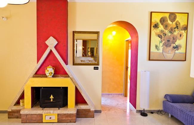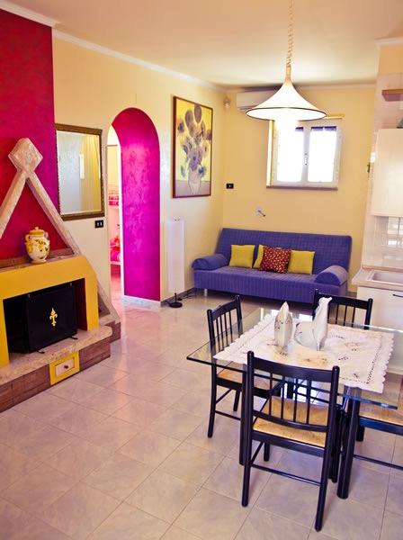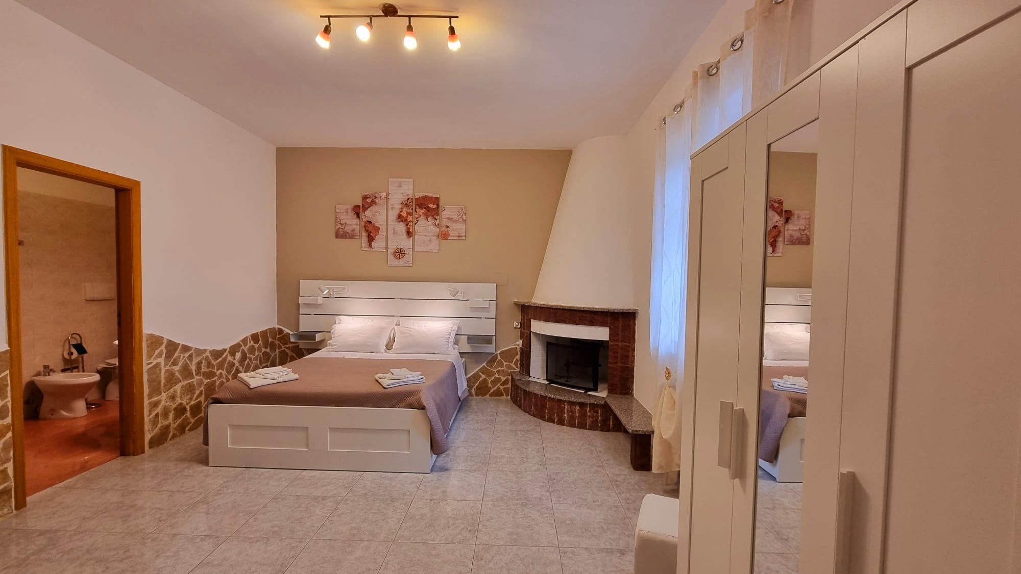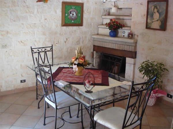 All’interno del trullo gli spazi sono organizzati in modo accogliente e funzionale. Il soggiorno, impreziosito da camino, arredi in ferro battuto e dettagli in pietra, rappresenta il cuore della casa. Da qui si accede alla camera matrimoniale, raccolta e intima, con armadi e vani contenitivi integrati nelle pareti. Un caratteristico arco conduce alla cucina, attrezzata per preparare colazioni e pasti leggeri, completa di macchina del caffè, frigorifero e accessori dedicati al comfort quotidiano.